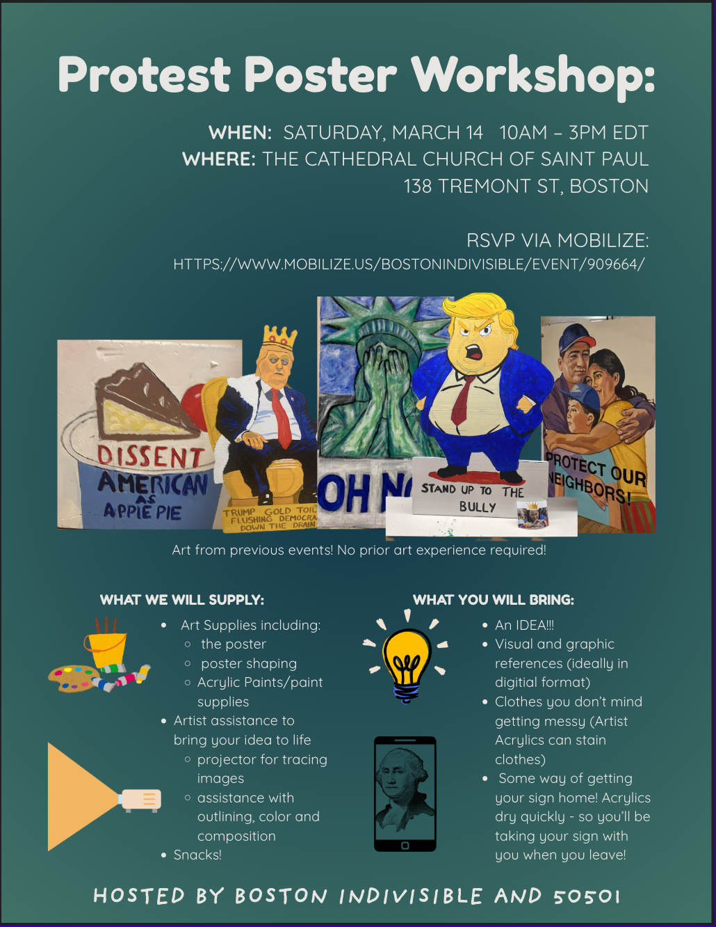 Art of the Resistance: Protest Poster Workshop Saturday, March 14, 2026 10:00 AM 3:00 PM The Cathedral Church of Saint Paul 138 Tremont Street Boston, MA, 02111 United States (map) Google Calendar ICS RSVP AT MOBILIZE